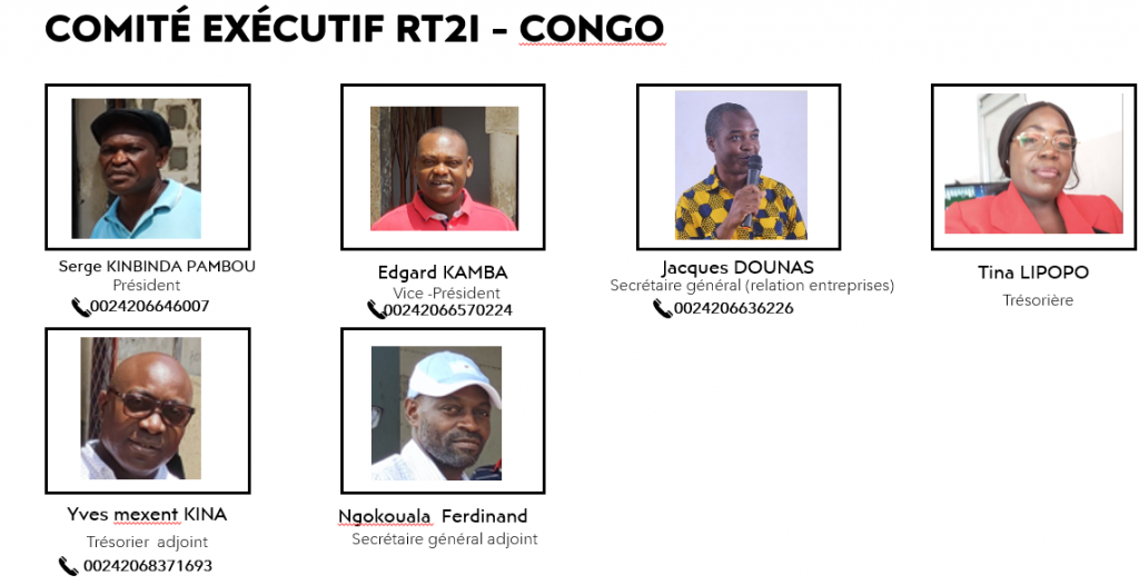•RT2i est une association fondé par les anciens élèves du Lycée technique Poaty Bernard de Pointe Noire vivant en France, au Congo, Canada et aux USA. L’association compte aujourd’hui 11 membres et son bureau exécutif est composé de 4 membres :